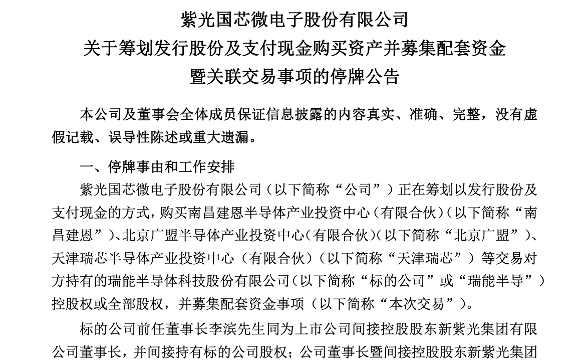 12月29日晚,紫光国微公告披露,正在筹划以发行股份及支付现金的方式,购买南昌建恩半导体产业投资中心(有限合伙)(下称“南昌建恩”)、北京广盟半导体产业投资中心(有限合伙)(下称“北京广盟”)、天津瑞芯半导体产业投资中心(有限合伙)(下称“天津瑞芯”)等交易对方持有的瑞能半导体科技股份有限公司(下称“瑞能半导体”)控股权或全部股权。